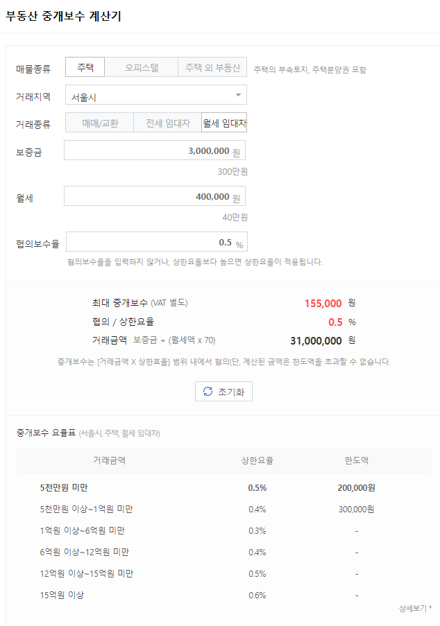 협의보수율을 잘 보시고 보증금, 월세 등을 입력하셔서 어느 정도 지출될것인지 예상할 수 있습니다.