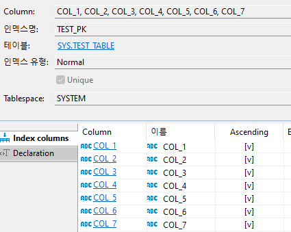 현재 INDEX는 테이블정보에 설명드린 것처럼 다중PK로 정렬된 것(COL_1 ... COL_7) 하나 뿐입니다.